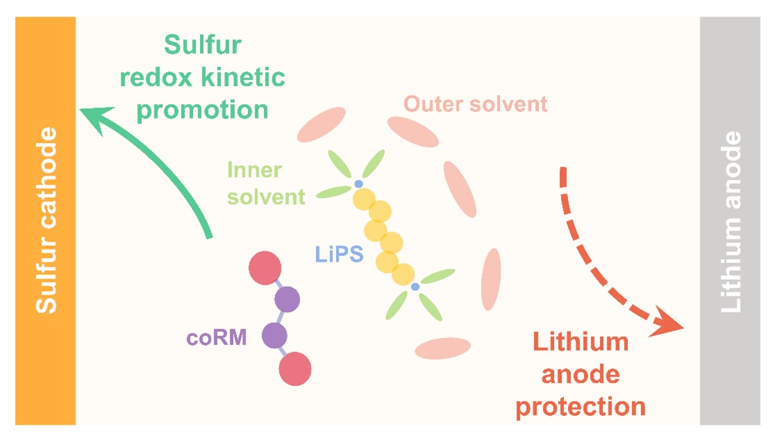 锂硫电池具有高达2600 Wh kg−1的理论能量密度,是最具前景的下一代二次电池体系之一,受到人们广泛关注。然而锂硫电池电解液中的可溶性多硫化物会与锂金属负极发生副反应,腐蚀锂负极,严重制约锂硫电池的循环寿命。通过有效调节多硫化物的溶剂化结构,封装多硫化物电解液(EPSE)能够抑制多硫化物与锂负极之间的副反应,有效延长锂硫电池寿命。但在由 EPSE 构建的多硫化物双壳层溶剂化结构中,其外壳层溶剂的溶剂化能力较弱,不可避免地牺牲了硫正极的反应动力学,使得采用 EPSE 的锂硫电池在提升循环寿命的同时,普遍存在电池充放电极化大、放电比容量低、倍率性能差以及软包电池能量密度低等一系列问题。