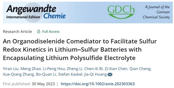 论文详情:Yiran Liu, Meng Zhao, Li-Peng Hou, Zheng Li, Chen-Xi Bi, Zi-Xian Chen, Qian Cheng, Xue-Qiang Zhang, Bo-Quan Li,* Stefan Kaskel, and Jia-Qi Huang*. Organodiselenide Comediator to Facilitate Sulfur Redox Kinetics with Encapsulating Lithium Polysulfide Electrolyte, Angewandte Chemie International Edition, DOI:10.1002/anie.202303363.