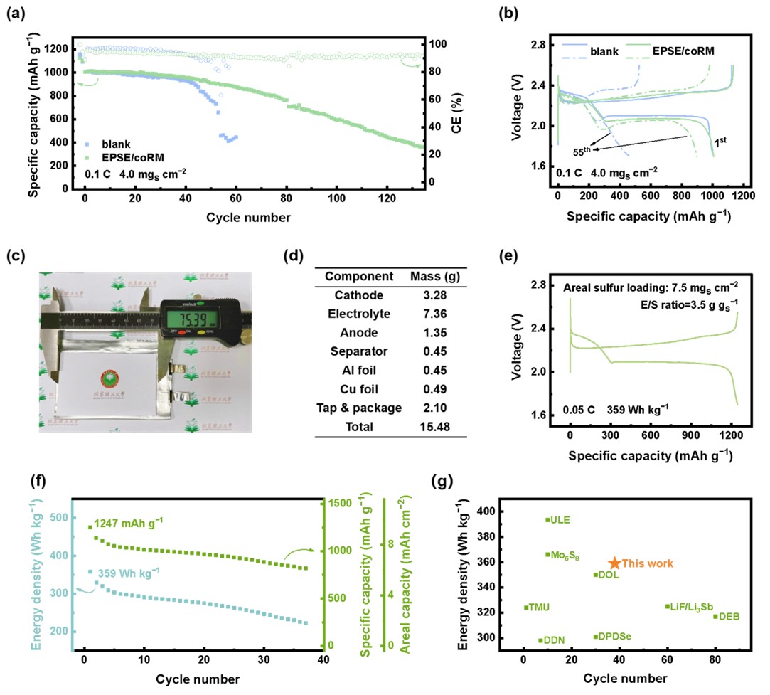 在使用50 μm薄锂负极和4.0 mgS cm−2高载量硫正极的条件下,EPSE/coRM体系在保持高放电比容量的前提下将锂硫纽扣电池的循环寿命提升至130圈,较之应用常规DOL/DME电解液的锂硫电池循环寿命延长近两倍。研究人员进一步组装并测试了设计容量为1.5 Ah 的EPSE/coRM锂硫软包电池,实现了359 Wh kg−1的首圈能量密度,并可以稳定循环37圈(能量密度基于所有软包电池组件计算得到)。
