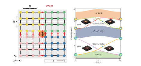 原二维声子晶体被设计成最简单的二维拓扑绝缘体模型:四重旋转对称(C4)的Su-Schrieffer-Heeger(SSH)模型。其等效后的二维晶格中心处类比通电螺线管,具有 Φ="kz(0~2π)" 的赝磁通(如下左图),而其他元格上的磁通都为0。整个体系没有打破时间反演对称性,实现了一种声学晶格上的“AB效应”。