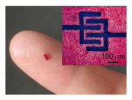 结果表明,单个皱缩后的MSC具有约0.02 cm2的小面积和13.5 mF cm-2的高面积比电容,分别比初始状态器件小13倍、大45倍。 同时,它还具有9.3 F cm-3的超高电极体积比电容(是初始状态器件的约3.6倍),优于之前报道的CNT基微型储能器件。 随后,我们从实验和理论模拟两方面进一步探讨了皱缩后MSC电化学性能提高的机理(图2)。 结果显示致密的褶皱结构提高了碳纳米管膜的电导,降低了碳纳米管膜的离子吸附能,从而提供了更多的有效活性表面积,增强了电极的电化学活性。 利用该策略,进一步实现了0.1 mm2的超小储能器件(图3),其中单个叉指的宽度和电极间隙分别仅为44和20微米。 这是目前使用丝网印刷方法可以得到的最小尺寸的器件,而不需要复杂的精密加工。