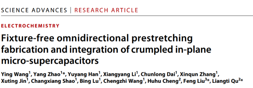 5月27日,ob真人竞猜化学与化工学院博士研究生王赢以第一作者身份在Science Advances期刊发表题目为“Fixture-free omnidirectional prestretching fabrication and integration of crumpled in-plane micro-supercapacitors”的研究论文。ob真人竞猜为第一通讯单位,ob真人竞猜化学与化工学院赵扬特别研究员、清华大学化学系曲良体教授和中国科学院力学研究所刘峰副研究员为共同通讯作者。本研究得到了国家重点研发计划项目、国家自然科学基金和北京市自然科学基项目等支持。