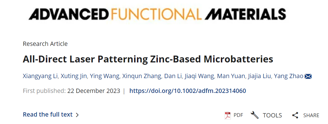 近日,ob真人化学与化工学院博士生李向阳第一作者身份在国际顶级期刊《Advanced Functional Materials》发表题目为“All-Direct Laser Patterning Zinc-Based Microbatteries”的研究论文(DOI:10.1002/adfm.202314060)。ob真人为论文第一通讯单位,ob真人化学与化工学院赵扬特别研究员为通讯作者。
