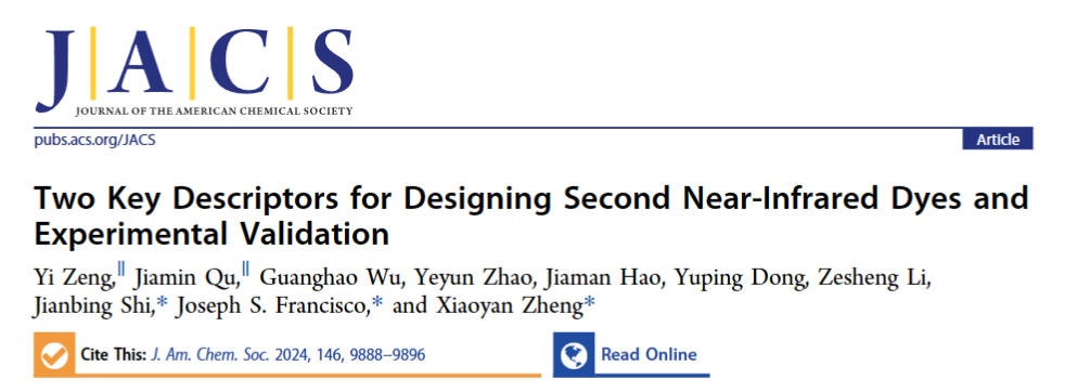近日,ob真人竞猜化学与化工学院郑小燕副教授和材料学院石建兵副教授,与美国宾夕法尼亚大学Francisco教授合作,在近红外二区(NIR-II)荧光染料理论设计方面取得重要进展。相关成果以“Two key descriptors for designing second near-infrared dyes and experimental validation”为题发表于国际顶级期刊《Journal of the American Chemical Society》。ob真人竞猜为第一通讯单位,曾怡和屈佳敏两位博士生为共同第一作者,郑小燕、石建兵和Francisco教授为共同通讯作者,李泽生教授和董宇平教授对本工作给予了重要指导。