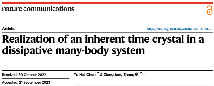 日前,ob真人物理学院陈宇辉研究员和张向东教授在时间晶体研究上取得重要突破,首次在实验上实现了固有的时间晶体,相关研究成果在Nature Communications上发表[Nat Commun (2023) 14:6161]。ob真人物理学院陈宇辉研究员为该论文的第一作者,ob真人物理学院张向东教授为论文的通讯作者。该工作得到了国家自然科学基金,ob真人青年教师学术启动计划以及ob真人青年科技创新计划的支持。该研究发表后引发广泛关注,受Nature集团Nature Portfolio Communities的邀请,在“Behind the Paper”栏目撰稿分享研究经历。