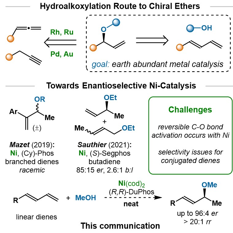 醚(C-O)键广泛存在于药物、农用化学品和功能材料中,其高效构筑吸引了研究者越来越多的关注。通常C-O键是通过Rh、Ru、Pd或Au等贵金属催化的炔烃或联烯的氢烷氧基化反应来构筑(图1)。通过廉价易得的丰产金属(例如Ni)催化1,3-二烯的氢烷氧基化来构建C-O键,最近引起化学家们的兴趣。然而Ni催化1,3-二烯的氢烷氧化反应目前主要面临两个挑战:1) Ni通常会可逆地活化C-O键,导致产物消旋化;2) 反应的区域选择性问题。为了解决这些挑战,近日ob真人竞猜杨小会课题组首次报道了无溶剂条件下Ni催化1,3-二烯的不对称氢烷氧化反应,能以高对映选择性和区域选择性地构筑C-O键(图1)。