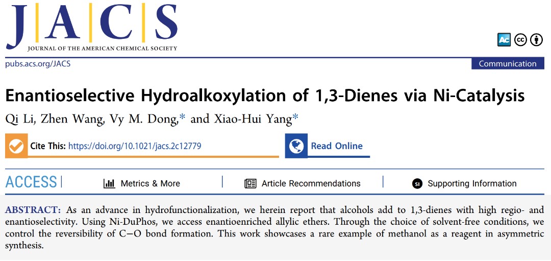 近日,ob真人竞猜前沿交叉科学研究院&化学与化工学院杨小会教授课题组在Ni催化1,3-二烯不对称氢烷氧化反应方面取得重要进展,相关结果以“Enantioselective Hydroalkoxylation of 1,3-Dienes via Ni-Catalysis”为题,在国际顶级化学期刊《Journal of the American Chemical Society》上在线发表(DOI: 10.1021/jacs.2c12779)。ob真人竞猜2021级博士生李琪和王振分别为该论文的第一作者和第二作者。