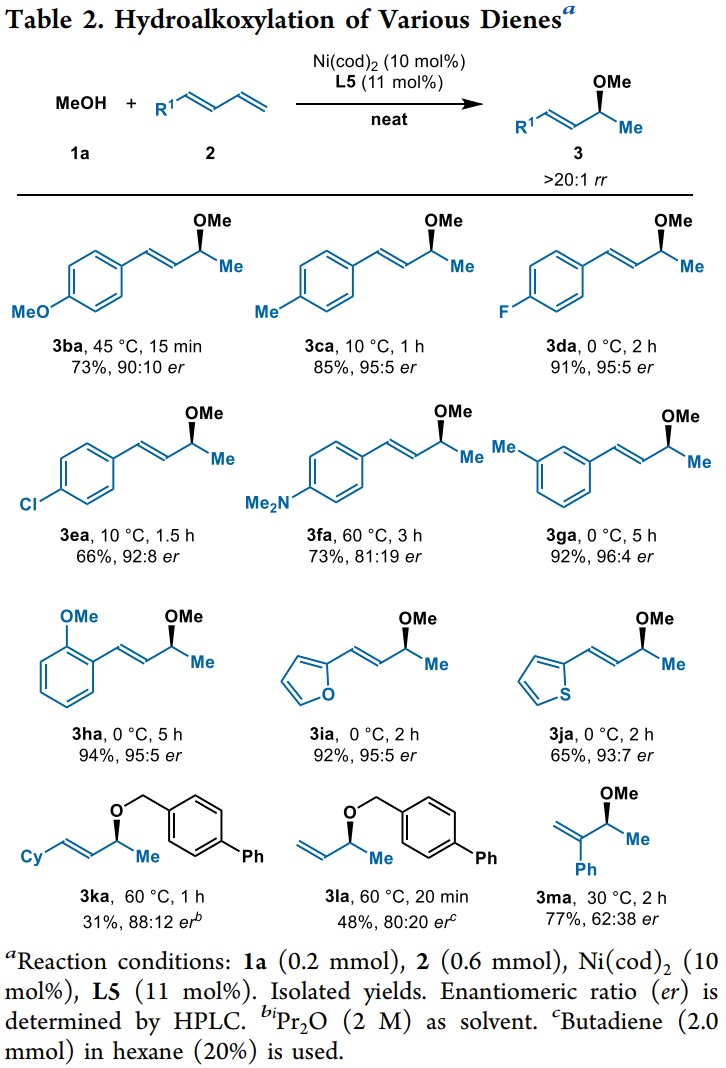 图2. 不同类型1,3-二烯的氢烷氧化反应