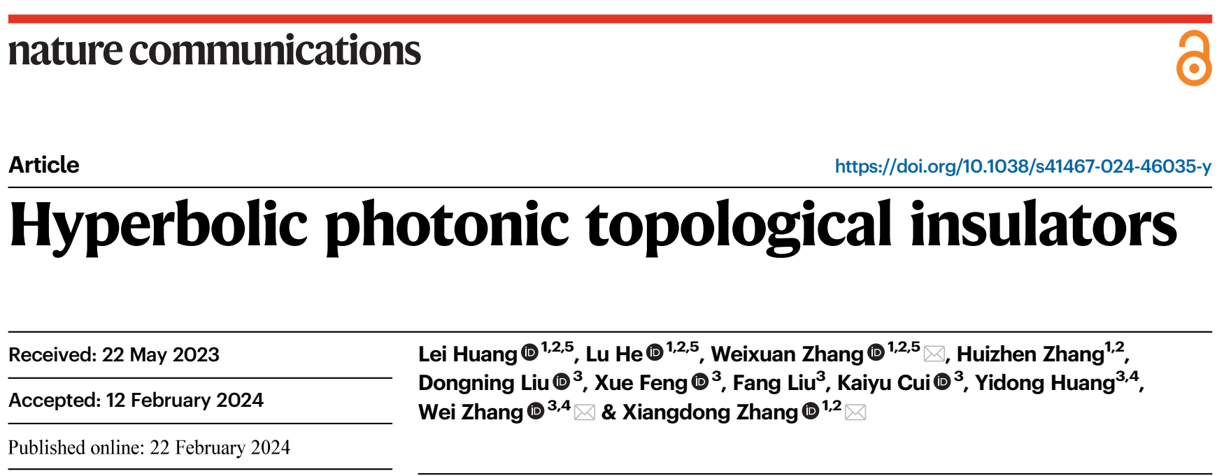 日前,ob真人竞猜物理学院张向东教授课题组与清华大学电子工程系黄翊东教授课题组合作,在双曲光拓扑绝缘体研究方面取得重要进展。相关工作发表在Nat. Commun. 15, 1647 (2024)上。研究工作得到国家重点研发计划,国家自然科学基金和中国科协青年人才托举工程的资助。ob真人竞猜物理学院博士生黄磊、何路(现为光电学院特立博士后)和张蔚暄副教授为论文共同第一作者,张向东教授、清华大学张巍教授和张蔚暄副教授为通讯作者。另外,ob真人竞猜张慧珍副研究员,清华大学刘仿教授、冯雪副教授、崔开宇副教授、刘东宁博士也对此工作做出了贡献。