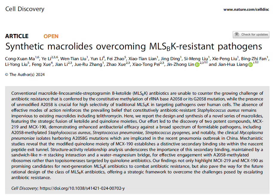 论文信息:Cong-Xuan Ma#, Ye Li#, Wen-Tian Liu, Yun Li, Fei Zhao, Xiao-Tian Lian, Jing Ding, Si-Meng Liu, Xie-Peng Liu, Bing-Zhi Fan, Li-Yong Liu, Feng Xue, Jian Li, Jue-Ru Zhang, Zhao Xue, Xiao-Tong Pei, Jin-Zhong Lin*, Jian-Hua Liang* Synthetic macrolides overcoming MLSBK-resistant pathogens. Cell Discovery, 2024, 10(75)DOI: 10.1038/s41421-024-00702-y