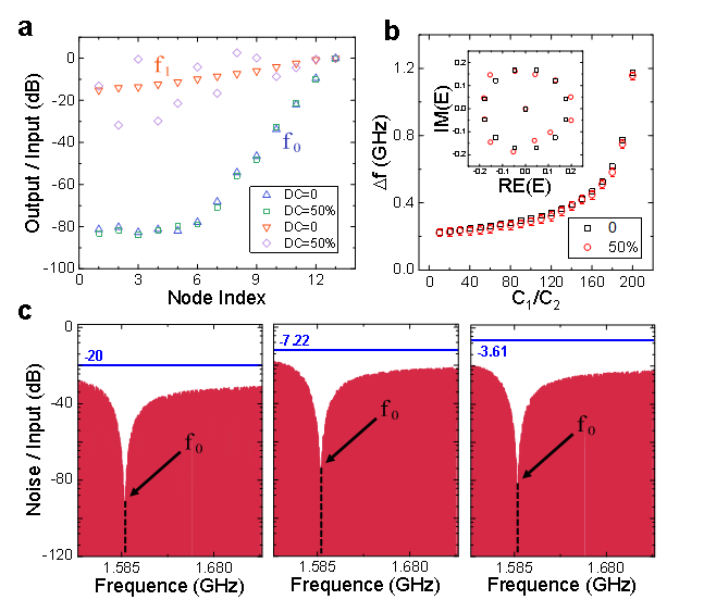 研究人员制备的芯片不仅具有很高的灵敏度,而且有强的鲁棒性。为了验证电路系统的鲁棒性,研究人员引入了无序串扰(DC),它是正常情况下实际噪声强度的1000多倍。在实验中,在信号输入节点额外输入直流电,并将直流电与主信号的百分比定义为直流电的强度,如10%、25%和50%。图4a显示了具有50%无序串扰的电压趋肤效应实验结果,这里的参数与图3b中的参数相同。当信号频率处于本征频率时,非互易系统中的趋肤效应具有极高的鲁棒性。即使由50%直流的信号驱动,系统的集肤效应电压也基本保持不变,如图4a中的蓝色(0直流)和绿色(50%直流)所示。与本征频率的情况相比,在随机频率(紫色和橙色)下,工作信号已经完全失真,趋肤效应不再存在。相应的传感实验结果如图4b所示。可以看出,在直流电的影响下,系统的传感性能没有受到太大影响,仍然保持指数灵敏度的特性。图4b的插图显示了相应的导纳谱,表明系统的趋附模式不受直流电的影响。该芯片之所以具有如此良好的鲁棒性,不仅是因为高阶拓扑特性,还因为电路设计中,该LC电路本身具有极强的带阻效应。在图4c中,我们提供了带阻效应的实验测量结果,其中的三个面板显示了DC=-20dB、-7.22dB和-7.23dB的实验测量结果。在所有情况下,本征频率附近都出现了强烈的带阻效应。这种效应有助于测量本征频率时降低噪声,提高系统精度和鲁棒性。