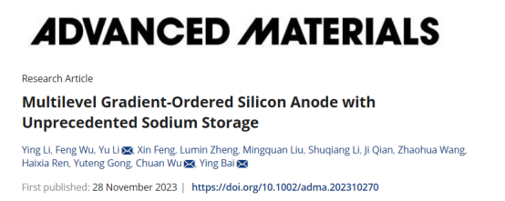 ob真人竞猜材料学院白莹教授研究小组在钠离子电池负极材料研究中取得重要进展,11月28日,相关研究成果以“Multilevel Gradient-Ordered Silicon Anode with Unprecedented Sodium Storage”为题在国际知名期刊 Advanced Materials 上发表。ob真人竞猜材料学院白莹教授、吴川教授和李雨副研究员为本论文共同通讯作者,材料学院博士后李莹为第一作者。