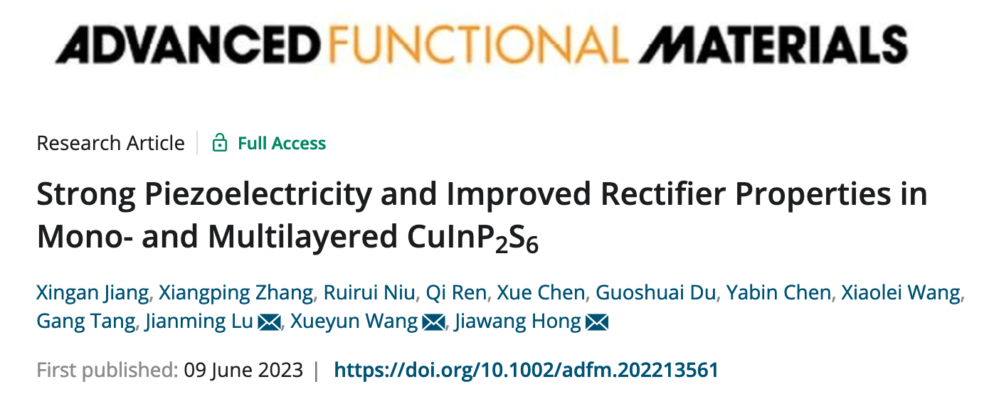 近日,ob真人竞猜宇航学院洪家旺教授、王学云副教授团队报道了单原子层厚度的二维范德瓦尔斯CuInP2S6铁电材料面外强压电性效应以及增强的电流自整流特性,相关成果以“Strong Piezoelectricity and Improved Rectifier Properties in Mono- and Multilayered CuInP2S6”为题,发表于国际顶级学术期刊《Advanced Functional Materials》。