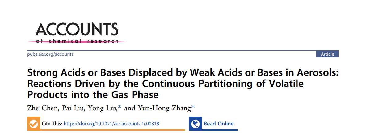 近日,Accounts of Chemical Research(《化学研究评述》)以“Strong Acids or Bases Displaced by Weak Acids or Bases in Aerosols: Reactions Driven by the Continuous Partitioning of Volatile Products into the Gas Phase”为题,在线发表了ob真人竞猜化学与化工学院张韫宏团队的综述文章,讨论了气溶胶体系中弱酸(弱碱)置换强酸(强碱)的独特现象。