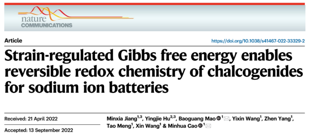 近日,ob真人竞猜化学与化工学院曹敏花教授团队在钠离子电池硫属化合物负极研究领域取得重要进展,相关研究成果以“Strain-regulated Gibbs free energy enables reversible redox chemistry of chalcogenides for sodium ion batteries”为题,在《Nature Communications》期刊上在线发表(DOI: 10.1038/s41467-022-33329-2)。该工作第一作者为2021级博士研究生姜敏霞,通讯作者为曹敏花教授、毛宝光博士后。