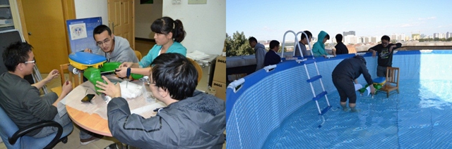 两栖蛙板机器人的制作过程充满了艰辛。在两代两栖机器人的制作以及调试过程中,团队成员遇到了很多困难:机械干涉问题、外壳难以安装、电机老化极其损坏、烧坏电路板、程序调试难题、信号干扰……;同时机械零件的绘制、外壳模型的建立与绘制、机器人的整体安装、加工厂的寻找、合同的签订、方案的制定……每一个过程都需要团队成员们亲力亲为。在这期间,团队成员夜以继日的奋斗在实验室,不顾课业繁重辛苦,不顾偌大的校园东西奔波,他们住在一起,学在一起,讨论在一起,一有时间就学习、讨论,时间的积累,沉淀的不仅是厚厚的知识更是浓浓的友情。在指导老师的指导与要求下,团队成员一步步完善机器人的性能以及内部结构,用实际行动和100%的精力去实现自己的挑战杯之梦。