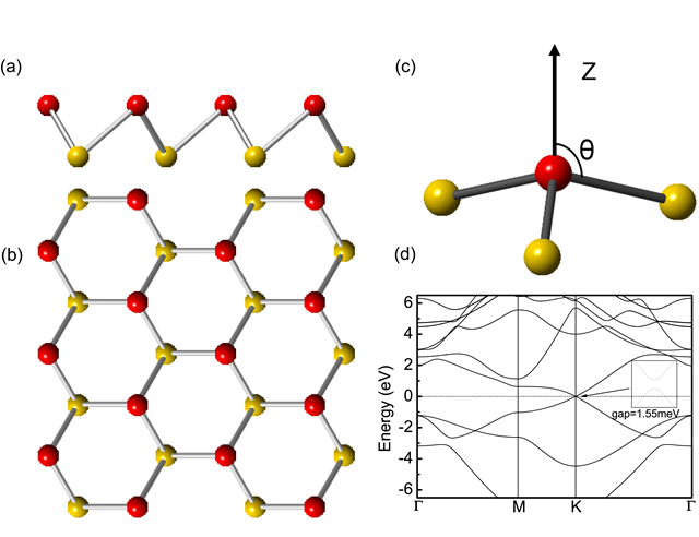 图1 硅烯的晶体结构和能带图。(a),(b)分别为侧视图和俯视图。(c)定义了一个起伏角度。(d) 能带图。放大的部分为由于自旋轨道耦合作用在狄拉克点打开的能隙结构。