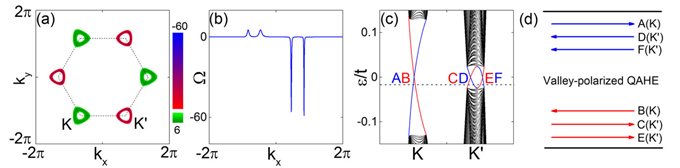 图2 (a) 硅烯中谷极化的量子反常霍尔效应的Berry 曲率倒空间二维分布。(b) 该Berry 曲率分布沿ky=0的高对称线的分布。(c) 硅烯zigzag纳米带的能带结构。黑色的代表体态,彩色的表示边界态,其中红色和蓝色表示相反的边界。(d) 谷极化的量子反常霍尔效应示意图。