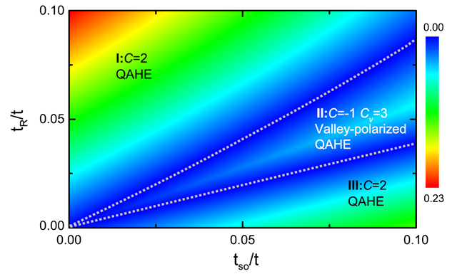 图3 硅烯在内禀Rashba tSO和外在Rashba tR二维参数空间的相图。点线代表相边界。相I和相III是陈数C=2的量子反常霍尔态,相II是陈数C=-1,以及谷陈数Cv=3的谷极化量子反常霍尔态。