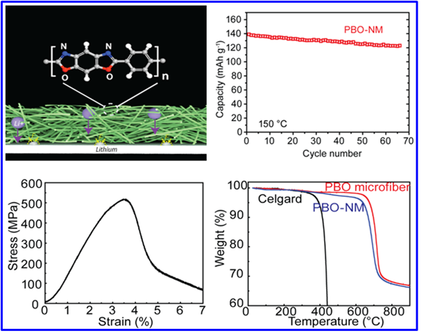 编辑:化工学院 杨鹏 阅读次数: 动力电池的安全性是电动汽车产业发展亟待解决的首要问题,其中,电池内部短路是现有锂离子电池安全性的最大隐患。ob真人竞猜孙克宁教授团队的郝晓明博士、王振华副教授与美国西北大学合作,针对现有电池隔膜在高温下稳定性不佳,容易收缩导致电池内部短路的实际问题,设计开发了一种全新的PBO基高强度、耐高温隔膜。PBO全称是聚对苯撑苯并二噁唑纤维(Poly-p-phenylene benzobisoxazole),被誉为21世纪超级纤维,具有十分优异的物理机械性能和化学性能,其强度、模量为Kevlar(凯芙拉)纤维的2倍并兼有间位芳纶耐热阻燃的性能,而且物理化学性能完全超过迄今在高性能纤维领域处于领先地位的Kevlar纤维。以PBO为基材的新体系隔膜其拉伸强度能够达到525Mpa,杨氏模量达到20GPa,耐热温度最高可达600℃。通过工艺改变,可以使薄膜的孔径范围在数um到10nm之间可调,当孔径在10nm左右时,该薄膜能够有效阻止锂枝晶生长,降低枝晶刺穿隔膜的风险,进一步提高锂电池的安全性。