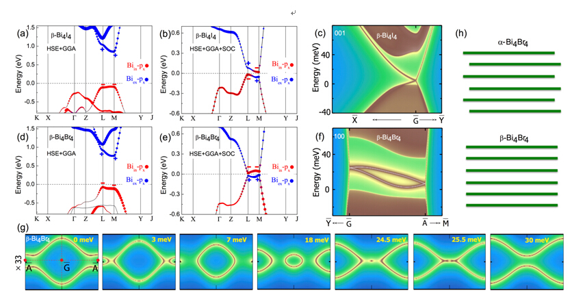 图2电子结构。(a) (b) ¬-Bi4I4有无自旋轨道耦合的能带结构。(c) ¬-Bi4I4的(001)表面态。(d)(e) ¬-Bi4Br4有无自旋轨道耦合的能带结构。(f) ¬-Bi4Br4的(100)表面态。(g) ¬-Bi4Br4的(001)表面态的Lifshitz转变。(h) / ¬-Bi4Br4的堆垛示意图。