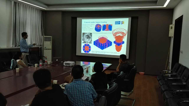 Timon Rabczuk教授是《International Journal of Impact Engineering》的副主编,无网格颗粒断裂法的创始人,在计算固体力学、流体-固体相互作用等研究方向做出了基础性和原创性的贡献。已发表的论文他引超过9000次,被ISI分别列为“Engineering”和“Computer Science”两个领域的高引用学者。报告中,Timon Rabczuk教授重点回顾了多尺度计算方法,提出了从原子模型到连续模型的一种简单而高效的计算算法,并在混凝土侵彻、薄壁壳体内爆等典型的爆炸与冲击问题模拟中得到了很好的应用。
