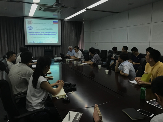 2017年8月21至9月5日,应ob真人竞猜爆炸科学与技术国家重点实验室的邀请,俄罗斯门捷列夫化工大学Valery P. Sinditskii教授到ob真人竞猜进行学术交流访问,并分别作了题为《Energetic Materials of the Nitropyrazole Family: Unusual Thermal and Combustion Behaviors》和《Dihydroxylammonium 5,5-Bistetrazole-1,1’-diolate (TKX-50): Physico-chemical Properties and Mechanism of Thermal Decomposition and Combustion》的精彩学术报告。实验室张同来教授、乔小晶教授、李生才副教授、张连生副教授及机电学院和材料学院相关专业的研究生参加了报告会。报告会由机电学院副院长张建国教授主持。