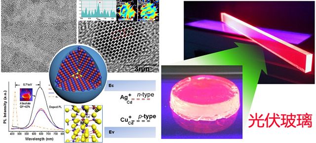 ob真人材料学院张加涛研究团队近三年,利用TBP、PPh3等膦配体引发的被掺杂离子的非晶半导体纳米颗粒与主体半导体阳离子之间的离子交换反应,调控其反应的热力学和动力学过程,实现被掺杂离子在半导体纳米晶(II-VI族等)中的深度位置的,异价取代性掺杂。实现了Ag+,Cu+离子在CdS,CdSe,以及CdSSe等半导体纳米结构(量子点,纳米片,2D薄膜)中的深度取代性掺杂及可控的掺杂浓度。一方面,实现了II-VI半导体量子点中稳定、高效的掺杂发光(绝对量子产率可达50%以上,稳定1年以上),有效避免了“自清洁”引起的掺杂发光不稳定性;另一方面,利用Ag+,Cu+的异质取代性掺杂,实现了p型,n型II-VI族量子点的制备及掺杂能级调控。此种掺杂发光有较大的Stokes位移(0.7 eV 以上)。利用原位甲基丙烯酸甲酯(MMA)配体交换,实现了这些掺杂纳米晶在有机玻璃里的厘米级宏观尺寸的均匀分散,进一步增大了Stokes位移(0.85 eV 以上),实现了优良的荧光聚集(Luminescence Solar Concentrator, LSC)性能。这些研究成果陆续发表在顶级SCI期刊《德国应用化学》(Angew. Chem. Int. Ed. 2015, 54,3683-3687)、《先进材料》 (Adv. Mater. 2015, 27,2753-2761)、《NPG亚洲材料》(NPG Asian Mater. (2015) 7, e152; doi:10.1038/am.2014.120)以及美国《物理化学C》杂志上(J. Phys. Chem. C 2017, 121, 6152−6159)上。