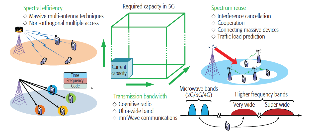 另一方面,经典的香农容量公式揭示了下一代无线蜂窝网络提高系统容量的三个主要技术路线及相关关键技术:更多数目的子信道,如大规模多输入多输出(Multiple-Input-Multiple-Output,MIMO)技术和非正交多址接入(Non-Orthogonal Multiple Access,NOMA)技术;更大的传输带宽,如通过频谱共享的认知无线电(Cognitive Radio,CR)、超宽带(Ultra-Wide Band,UWB)传输和通过频谱扩展的毫米波通信技术;通过增加单位面积更多的小区来获得更好频谱复用的技术,如超密集组网(Ultra-Dense Network,UDN)技术。
