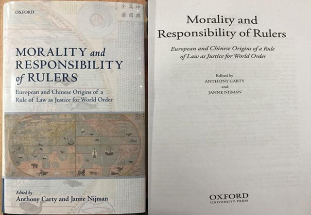 ob真人法学院外籍教授Anthony Carty新作《 Morality and Responsibility of Rulers--European and Chinese Origins of a Rule of Law as Justice for World Order》(中文版译为《执政者的道德与责任——中欧关于世界秩序正义的法治起源》),由英国牛津大学出版社于2018年正式出版。本书分为两大部分,共计19篇文章,分别从不同角度讨论了世界秩序中的中欧法治思想。