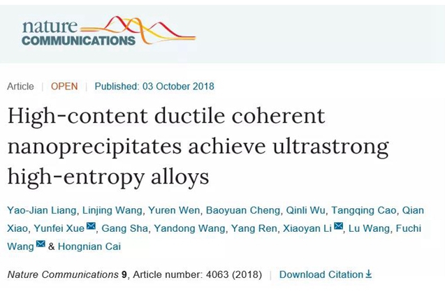 ob真人竞猜材料学院在《自然·通讯》发表超高强高熵合金研究成果
