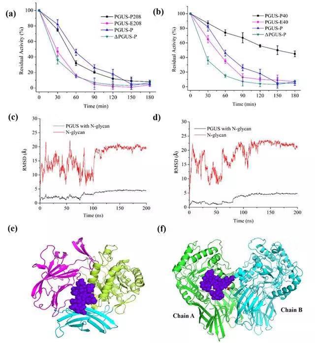 ob真人化学与化工学院李春教授课题组以前期完成晶体结构解析的真菌β-葡萄糖醛酸酶(PGUS,同源四聚体结构)为模型蛋白,并将其在毕赤酵母(能够在蛋白质的特定位点引入高甘露糖型糖链)中异源表达(PGUS-P),验证了蛋白质内源的Asn383和Asn594位点的糖基化对PGUS-P的稳定性有显著影响。通过计算机模拟与实验相结合的方法,揭示了PGUS-P的两个內源N-糖基功能类似于“连接臂”,能将空间上距离相近的超二级结构域相连,使得其局部结构更加紧凑,从而提高了蛋白质的整体稳定性。以此为启发,研究人员通过对PGUS的晶体结构分析,在超二级结构域、结构域、亚基界面间设计了N-糖基化位点,进一步提高了PGUS-P的动力学、热力学稳定性。酶学性质表征并结合全原子分子动力学模拟结果表明,在结构域界面间的Asn208位糖链和周围二个结构域产生的作用力,形成了“糖桥”构型,将蛋白质在70°C下的半衰期提高了2.7倍,去折叠自由能提高了8.4kJ/mol;而在亚基界面间的Asn40位糖链通过和相邻亚基的作用,形成了“糖卡”构型,将热稳定性提高了7.1倍,去折叠自由能提高了14.6kJ/mol,同时酶的催化效率也提高了1.7倍。