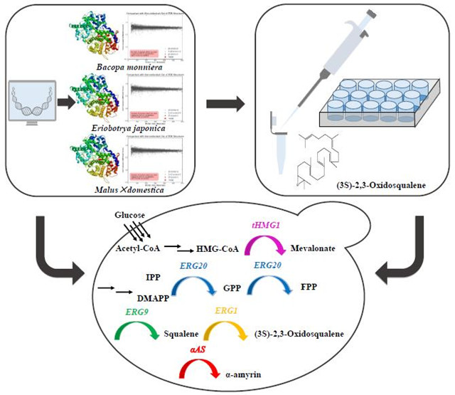 萜类化合物是植物次级代谢产物中最大的一个家族,广泛分布于自然界中,α-香树脂醇是植物当中重要的五环三萜,具有重要的生理和药理活性。α-香树脂醇是由(3S)-2,3-氧化鲨烯在氧化鲨烯环化酶蛋白家族α-香树脂醇合酶(α-AS)的催化下形成的。由于α-香树脂醇在植物中的含量极低,分离纯化步骤繁杂,目前尚未商业化开发生产。利用整合了高效α-AS的工程化酿酒酵母,可用作α-香树脂醇的可持续生产方案。