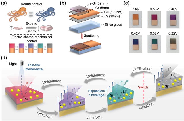 大自然中有多种能够自适应变色伪装的生物,以章鱼为例,当外界环境发生改变时,章鱼能够通过主动调控皮肤细胞中蛋白质的体积来改变光在不同界面的相位差,从而实现皮肤变色。方岱宁课题组通过设计具有稳定可逆膨胀的硅膜电极,模仿章鱼皮肤变色机理,巧妙地利用嵌锂电位(<1 V),精确控制锂离子在硅薄膜中的脱嵌行为,实现硅膜的高精度体积变化调控,改变硅膜结构对光线反射产生干涉消光条件,获得一系列绚丽色彩。值得一提的是,调控硅薄膜中的嵌锂程度,可以实现关闭或开启光线干扰作用,器件可以实现彩色至银色的切换功能。