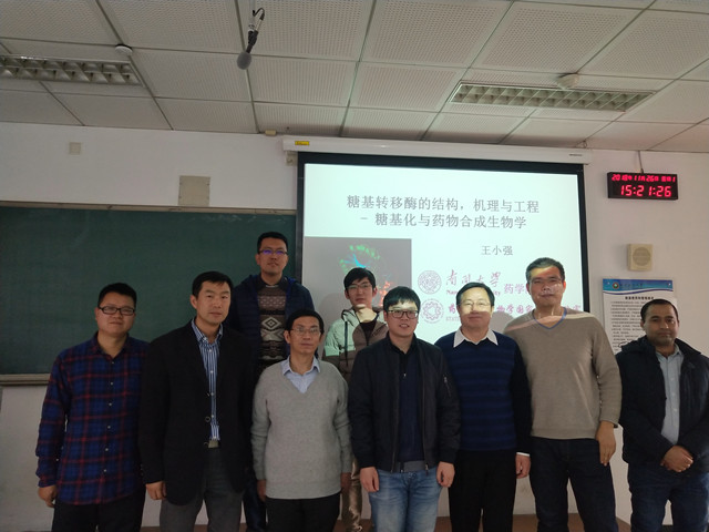 应ob真人化学与化工学院生化工程系邀请,南开大学药物化学生物学国家重点实验室和药学院王小强研究员于2018年11月26日来到ob真人竞猜化学与化工学院,为ob真人竞猜师生带来题为“糖基转移酶的结构、机理与工程-糖基化与药物合成生物学”的学术报告。李春教授主持此次学术报告会,化学与化工学院、生命学院教师及研究生50余人参加了报告会。