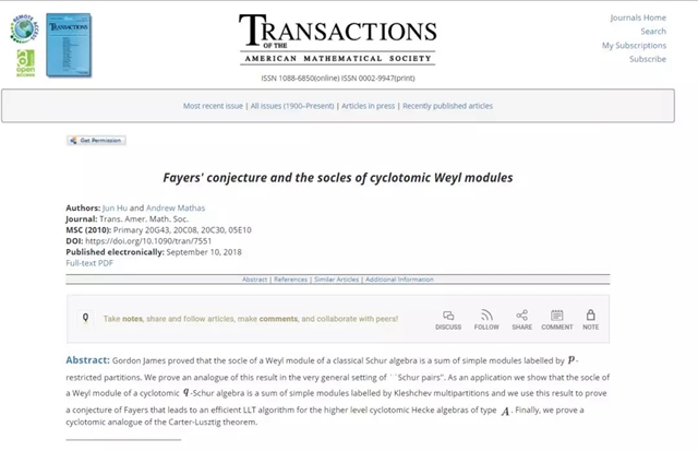 ob真人胡峻教授在《Transactions of the AMS》上发表Wey模的基座的研究成果