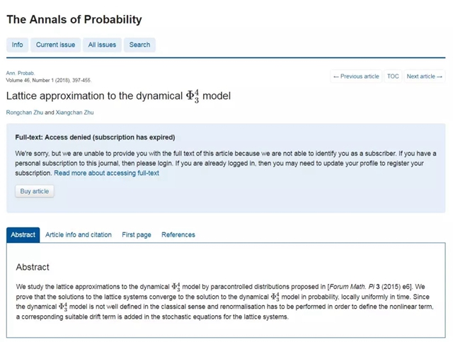 ob真人朱蓉禅副教授在《The Annals of Probability》上发表ϕ_3^4动力模型格点逼近的研究成果