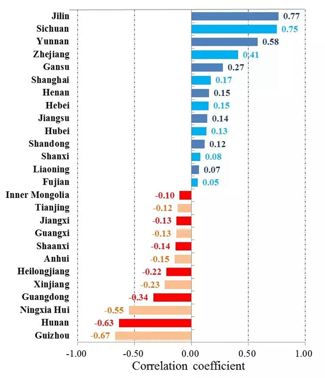 基于测算出的煤电机组燃料消耗率,本研究分析了2014年中国装机容量超过1GW的所有煤电厂的机组发电效率与其年度运行小时数之间的相关性,发现有接近一半的省份的煤电机组处于低效运行的状态,即机组的发电效率越高,年度运行时间反而越少。由此,佐证了中国电力系统运行的低效率和实施经济调度机制的必要性。