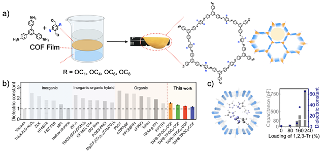 有机多孔材料大多不溶不熔,为其进一步器件化等实际应用带来了巨大挑战。该团队在前期大量成膜化研究基础上,成功利用液液界面成膜法开发了具有不同长度烷氧基链修饰的系列COF薄膜材料,并对其介电常数等相关性质进行了研究。该系列柔性的COF膜具有接近于空气的介电常数值(在105 Hz下, κ = 1.19 ± 0.04),可媲美目前已报道的无机多孔材料,并且这类COF薄膜材料表现出较好的机械性能、低介电损耗、高击穿电压、低漏电流、高抗湿度和抗弯折能力。低介电常数材料被广泛应用于电子电路器件中的绝缘层,用于减少信号延迟、串扰噪声和能量耗散。除此之外,高介电常数材料可以应用于场效应晶体管的栅极和电容器当中,该团队还利用COF薄膜装载小分子极性化合物,可将其介电常数提升43倍。该研究工作发表在德国应用化学上( Angew. Chem. Int. Ed. , 2018, 57, 16501),文章第一作者为博士生邵鹏鹏、李婕,通讯作者为王博和冯霄。