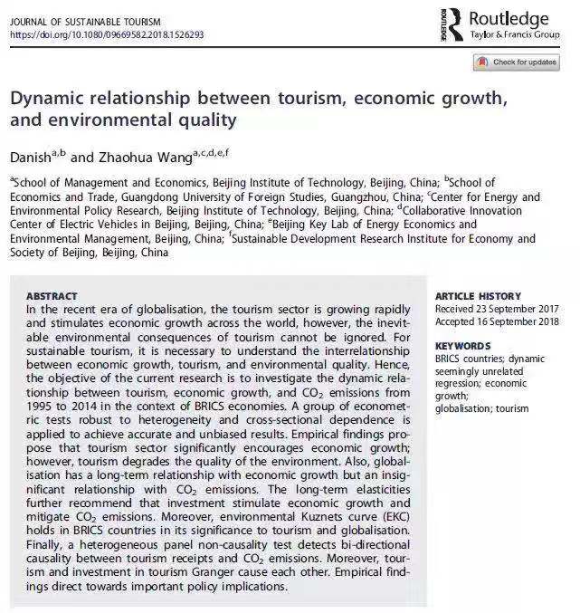 ob真人竞猜管理与经济学院王兆华教授领衔的团队研究成果“旅游、经济与环境质量的动态关系”(Dynamic Relationship Between Tourism, Economic Growth, and Environmental Quality),发表于国际旅游研究顶级期刊《Journal Of Sustainable Tourism》。该刊是国际旅游研究中公认的四大权威期刊之一,根据Web of Science期刊排名,该期刊在SSCI期刊“绿色&可持续科学&技术”类别中排名第一,属SSCI一区期刊。文章第一作者Danish博士为我院研究生,王兆华教授是该文通讯作者。