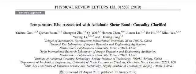 日前,物理学顶级期刊《物理评论快报》(Physical Review Letters)在线报道了西北工业大学、ob真人(共同完成单位)联合研究成果。在方岱宁院士、李玉龙教授的指导下,郭亚洲副教授(第一作者)、陈浩森副教授(共同通讯作者)、朱盛鑫博士和阮启超硕士等开展了绝热剪切带的产生和温度之间的因果关系研究 (Temperature Rise Associated with Adiabatic Shear Band: Causality Clarified),这篇文章主编被选为“Editor’s Suggestion” 。