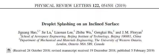 日前,ob真人宇航学院郝继光讲师、胡更开教授和加拿大西安大略大学Floryan教授合作在物理学顶级的学术期刊《Physical Review Letters》上发表了题为《Droplet splashing on an inclined surface》的研究论文。郝继光为该论文第一和通讯作者,宇航学院2018级硕士研究生鲁杰、2015级本科生李辽南及2017级硕士研究生吴志鹄分别为第二、第三和第四作者,ob真人为论文的第一单位和唯一通讯单位,该工作得到了国家自然科学基金和“111”引智计划的支持。