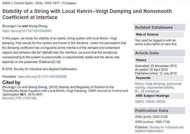 日前,ob真人数学与统计学院张琼副教授与美国明尼苏达大学Zhuangyi Liu教授合作在国际顶级学术期刊《SIAM Journal of Control and Optimization》上发表了题为“Stability of a string with local Kelvin–Voigt damping and nonsmooth coefficient at interface”和“Stability and regularity of solution to the Timoshenko beam equation with local Kelvin-Voigt damping”的研究论文。这两篇论文分别分析了具局部分布的Kelvin–Voigt扰动的弦系统和Timoshenko梁系统的稳定性与正则性。