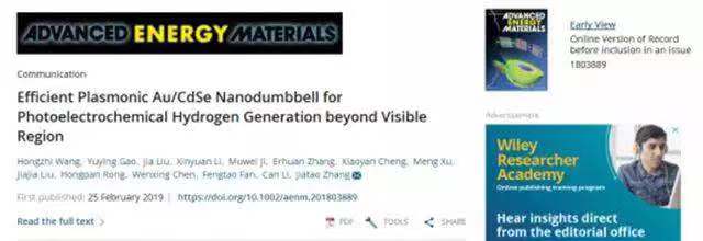团队与中科院大连化物所李灿院士团队合作,在金属@半导体异质纳米结构研究积累基础上(Science, 2010; Adv. Mater., 2014; Angew. Chem. Int. Ed., 2015; Adv. Mater., 2016; Nano Energy, 2018; Nano Energy, 2019; J. Mater. Chem. Mater. A, 2018)通过精确调控Au/Ag核壳纳米晶的硒化反应以及逆向竞争的水相阳离子交换反应,实现了从核壳结构(core/shell)到哑铃结构(nanodumbbell)演变的Au/CdSe异质纳米棒的制备及异质界面的高质量构建。得益于Au棒的纵向SPR效应及两端的电磁场增强“热点”以及高质量的异质界面,制备的Au/CdSe HNRs在近红外区具有很强的光吸收特性,实现了Plasmon增强的高效热电子注入效应。结合空间分辨的表面光电压成像表征(与李灿院士团队合作),成功研发出一种在近红外光波段具有高的吸收效率,又具有高的可见-近红外光电催化产氢性能,且其法拉第效率高达96%的光电催化材料。光电催化产氢活性(45.29 μmol cm-2 h-1)通过5天的连续测试,没有明显降低。ob真人竞猜的王虹智博士研究生以及大连化物所的高玉英博士研究生为共同第一作者。相关工作以“Efficient plasmonic Au/CdSe Nano-dumbbell for Photoelectrochemical Hydrogen Generation beyond Visible Region”为题,在线发表在《Advanced Energy Materials》 (2019, DOI: 10.1002/aenm.201803889)上。