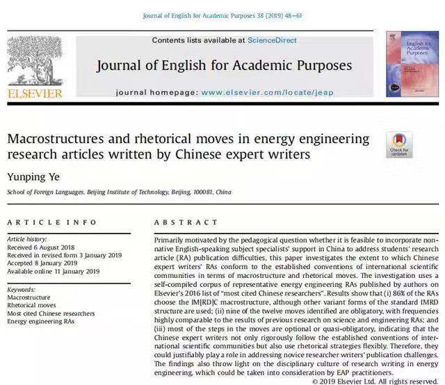 ob真人外国语学院叶云屏教授对70多名高被引“中国能源专家科研论文宏观结构和修辞语步”的研究论文于2019年在《学术英语期刊》(Journal of English for Academic Purposes)第38卷发表,填补了国际语言学界对该领域科研论文研究的空白以及对中国专家学术写作特征研究的空白,为国内外学术写作教学实践提供了重要启示。