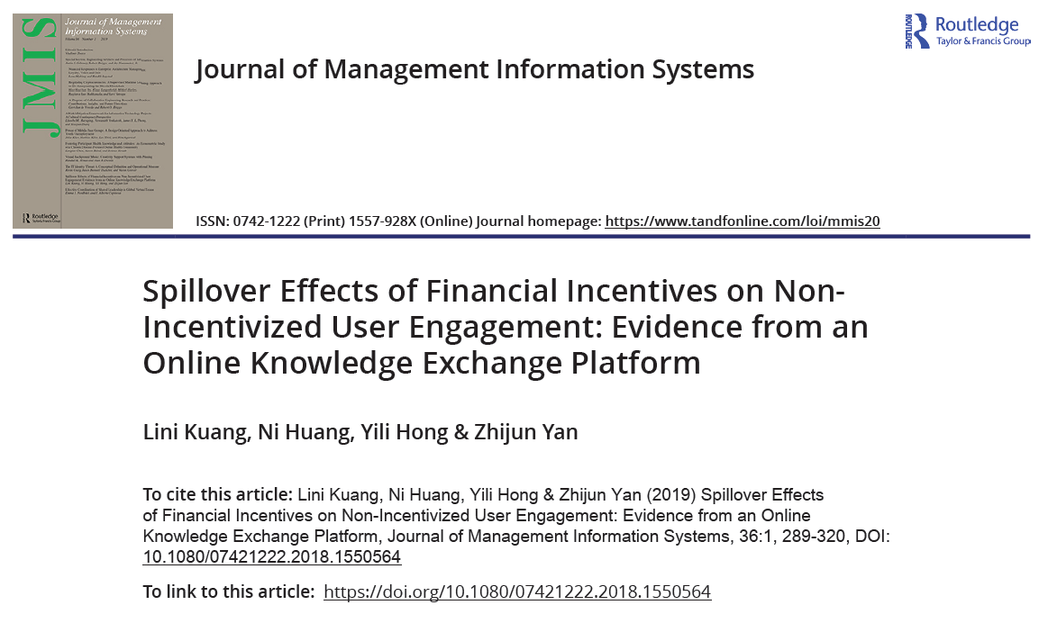 Lini Kuang, Ni Huang, Yili Hong & Zhijun Yan (2019) Spillover Effects of Financial Incentives on Non-Incentivized User Engagement: Evidence from an Online Knowledge Exchange Platform, Journal of Management Information Systems, 36:1, 289-320, DOI: 10.1080/07421222.2018.1550564