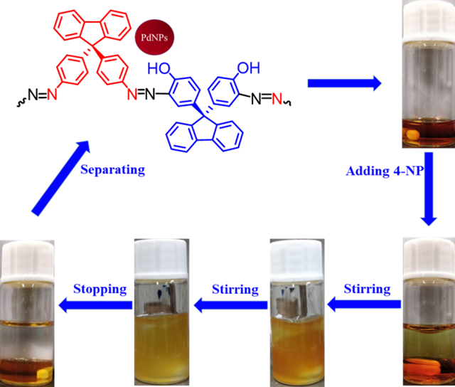 利用有机/水两相法催化还原4-硝基苯酚,具有反应高效,催化剂回收简单,可重复使用等特点。利用紫外-可见光吸收光谱对催化反应进行跟踪和动力学研究,发现Pd@Azo-POP-7作为催化剂,反应的速率常数高达4.95×10−2 s−1,是目前报道的最高值。