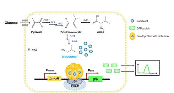异丁醇作为性能优异的高级醇,有望成为新一代运输燃料。然而其生物合成的产量不足以满足工业生产需求,因此需要筛选高产的宿主。生物传感器是合成生物学中的热门元件,通过设计和构建生物传感器,可以使细胞响应自身小分子浓度的变化并输出便于检测的荧光蛋白信号。生物传感器结合FACS技术是一种简单快速,高通量筛选理想表型的有力工具,因而已经被广泛地应用于高产菌株筛选和代谢途径调控。