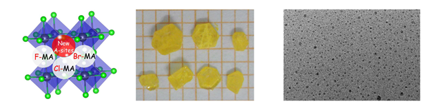 钟海政课题组是国际上最早报道钙钛矿量子点研究的研究团队之一。前期研究中,他们发明的钙钛矿量子点的再沉淀制备技术和原位制备技术,已经成为制备钙钛矿量子点的经典方法之一,被同行广泛使用,代表性工作包括ACS Nano 2015 , 9, 4533-4542, Google引用913次; Advanced Materials 2016, 28, 9163-9168,Google引用209次;Angew Chem 2017, 56, 1780-1783; ACS Nano 2018, 12, 8808-881; Advanced Functional Materials 2018, 1706567;Advanced Functional Materials 2019, 1903648。最近,该课题组发展了卤代甲铵盐的制备方法,采用亲核反应机理,利用氨气与卤代甲烷反应,解决了卤代甲胺盐难以制备的难题,成功合成了系列卤代甲胺盐,利用所合成的氟取代甲胺盐(FMABr)制备出3D FMAPbBr3钙钛矿单晶和量子点材料,材料表征表明该类钙钛矿材料热稳定性较好,激子结合能较小。该研究打破了三维钙钛矿的材料设计中A位分子的限制,为钙钛矿光电器件应用提供了新的材料选择,有望进一步推动钙钛矿材料的光电器件研究。