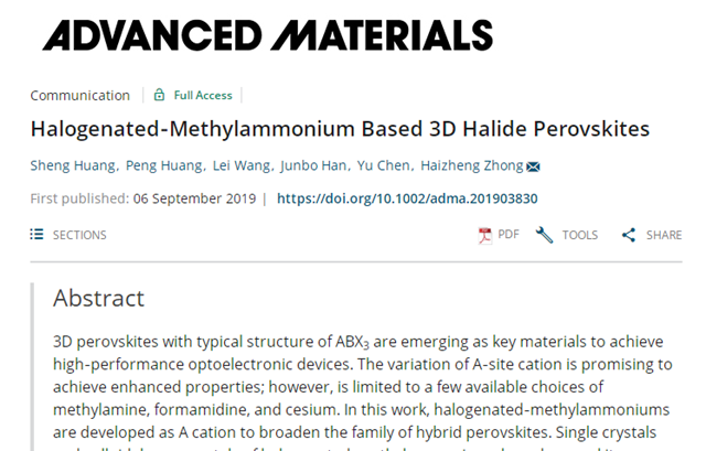 近日,ob真人竞猜材料学院钟海政课题组在钙钛矿材料A位分子的设计和制备方面取得突破进展,于2019年9月6日在材料领域的顶级期刊《Advanced Materials》上在线发表, Halogenated-Methylammonium Based 3D Halide Perovskites, Advanced Materials 2019, 31, 1903830 (https://onlinelibrary.wiley.com/doi/10.1002/adma.201903830)。论文发表后很快获得“纳米人”等学术媒体关注和报道。